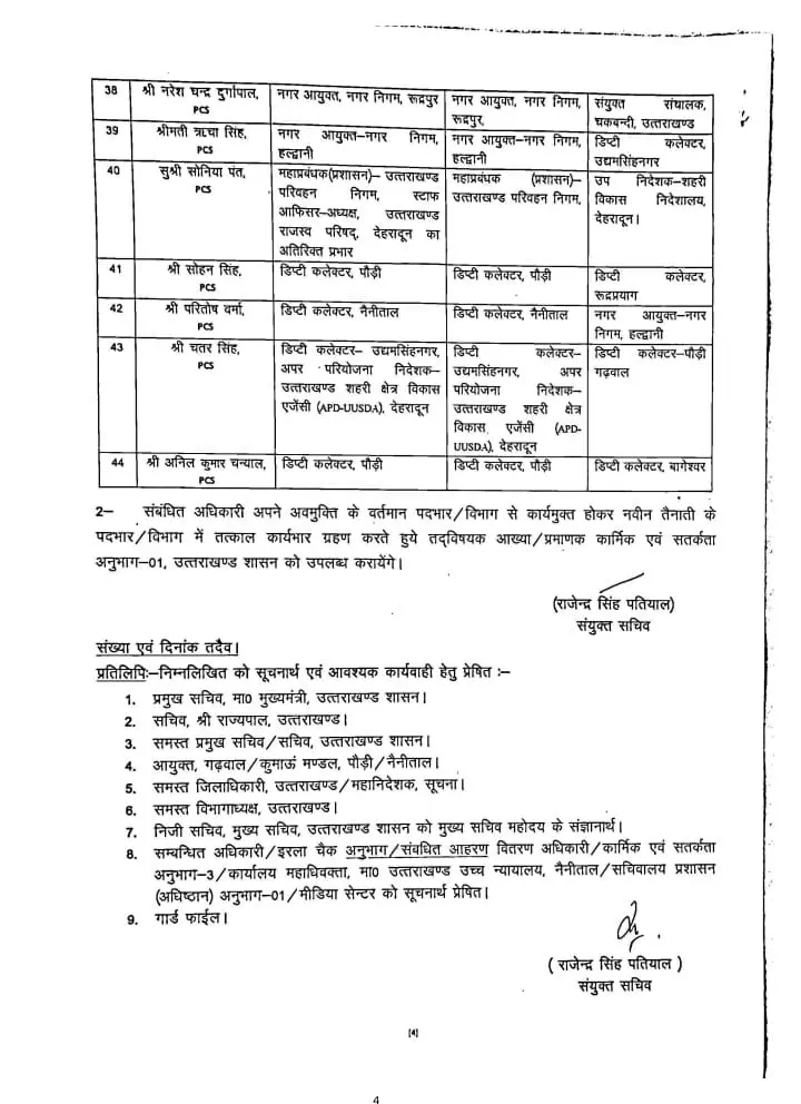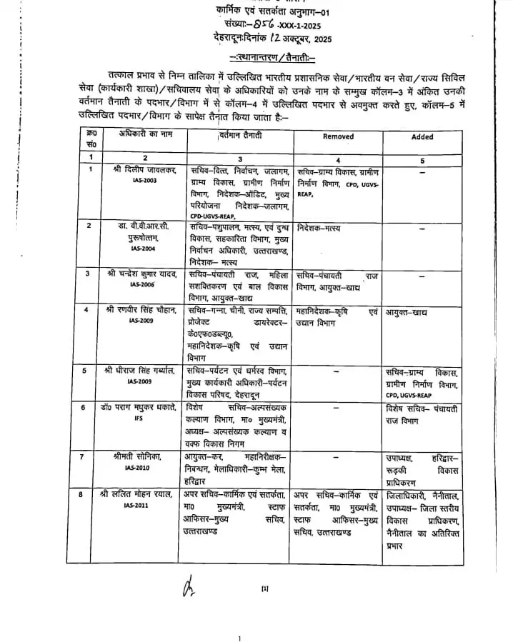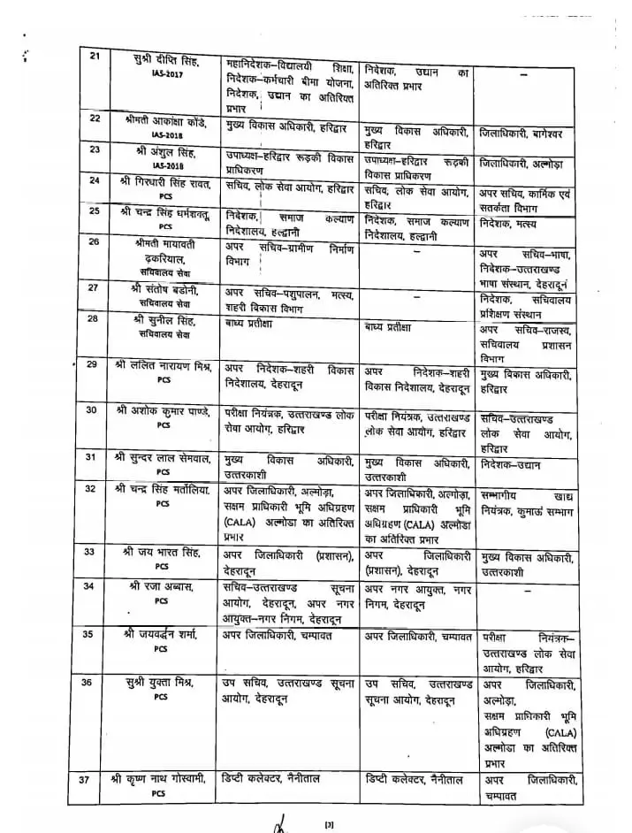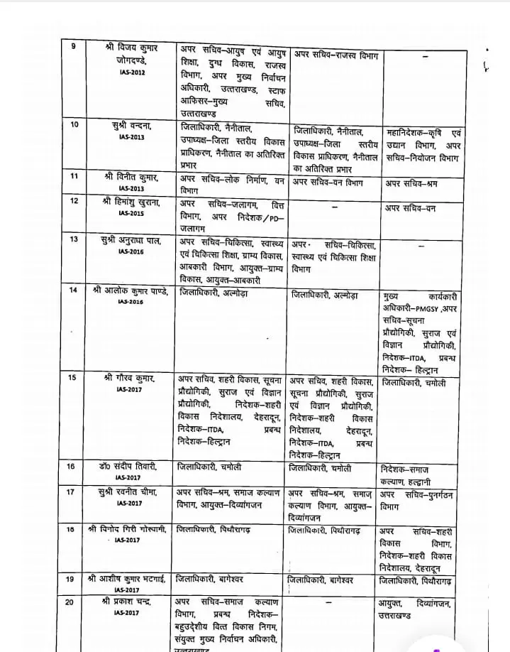 देहरादून: उत्तराखंड शासन ने आज (रविवार) को राज्य स्तर पर एक बड़ा प्रशासनिक फेरबदल किया है। इस फेरबदल के तहत कुल 44 अधिकारियों के कार्यक्षेत्र में बदलाव किया गया है…जिनमें 22 IAS अधिकारी, 19 PCS अधिकारी, 1 IFS अधिकारी और अन्य प्रशासनिक अधिकारी शामिल हैं।