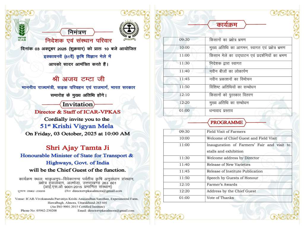 (विवेकानंद पर्वतीय कृषि अनुसंधान परिषद द्वारा आयोजित मेले में केन्द्रीय राज्यमंत्री अजय टम्टा मुख्य अतिथि होंगे)