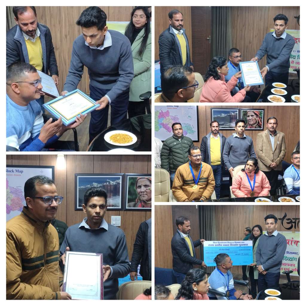 विश्व दिव्यांग दिवस के अवसर पर जिलाधिकारी अंशुल सिंह ने उत्कृष्ट कार्य करने वाले 3 दक्ष दिव्यांगजनों को राज्य स्तरीय दिव्यांग पुरस्कार प्रदान कर सम्मानित किया।कार्यक्रम में जिलाधिकारी ने सम्मानित दिव्यागजनों से वार्ता करते हुए उनकी समस्याएं विस्तार से सुनी। उन्होंने संबंधित विभागीय अधिकारियों को निर्देश दिए कि दिव्यांगजन की आवश्यकताओं और समस्याओं के निस्तारण हेतु प्रभावी कार्रवाई सुनिश्चित की जाए। राज्य स्तरीय दिव्यांग दक्षता पुरस्कार हेतु जनपद अल्मोड़ा से 4 दिव्यांगों का चयन हुआ है। कलेक्ट्रेट में आयोजित सम्मान समारोह में सौरभ तिवारी, रेखा आर्य तथा हिमांशु रावत को जिलाधिकारी ने सम्मानित कर प्रशस्ति पत्र तथा प्रत्येक को 8 हजार रुपए की सहायता राशि के चेक वितरित किए। जबकि पुरस्कार के लिए चयनित चौथे चयनित अर्चना जोशी को हल्द्वानी में सम्मानित किया गया।