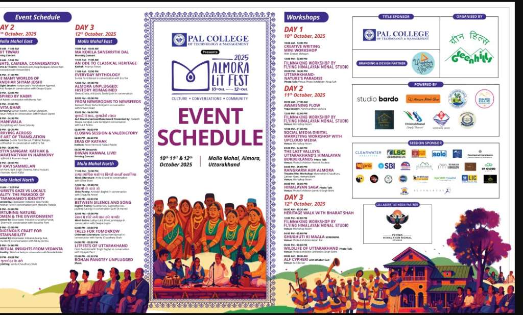 ग्रीन हिल ट्रस्ट संस्था द्वारा अपना तीसरा अल्मोड़ा साहित्य महोत्सव 10अक्टूबर से 12अक्टूबर तक मल्ला महल अल्मोड़ा ( पुरानी कलेक्ट्रेट) में आयोजित किया जा रहा है। संस्था की निदेशक वसुधा पंत ने बताया तीन दिवसीय इस साहित्य महोत्सव में 40 से अधिक सत्रों का आयोजन किया जायेगा, जिसमें विभिन्न विषयों पर चर्चा होगी| साथ ही, युवा प्रतिभाओं के लिए ओपन माइक सेशन और विशेष कार्यशालाएँ भी आयोजित की जाएगी। बच्चों के लिए एक विशेष खंड रखा गया है, जिसमें स्टोरी टेलिंग, कहानी लेखन और वित्तीय साक्षरता जैसे विषयों पर रोचक गतिविधियाँ होंगी।
