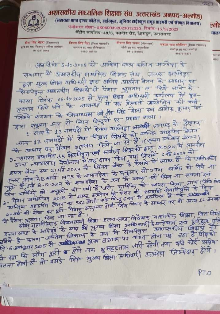 मुख्य शिक्षा अधिकारी के अन्याय पूर्ण रवैया,व पेंशन में अनावश्यक कटोतियों को लेकर खफा शिक्षकों ने आमरण अनशन पर बैठने का निर्णय लिया है। खफा शिक्षकों का कहना है पिछले 3 वर्षों से मुख्य शिक्षा अधिकारी कार्यालय अलमोडा़ में सेवानिवृत्त होने वाले शिक्षकों के साथ अन्याय पूर्ण रवैया हो रहा है जो उत्तराखंड राज्य के अन्य 12 जिलों में नहीं रहा है ।